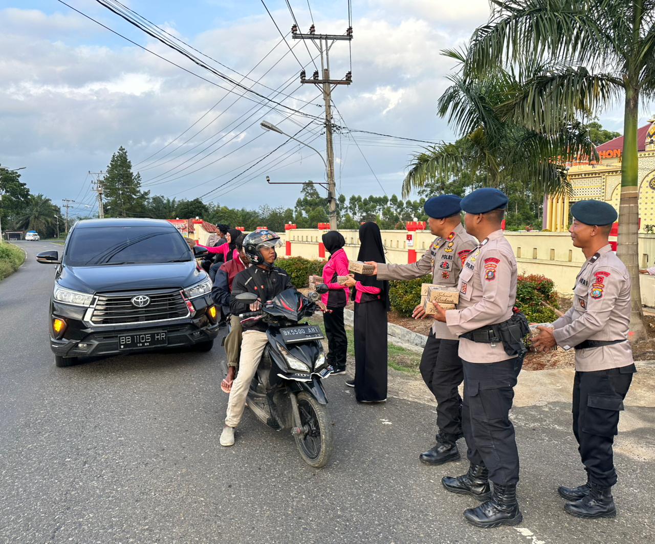 Sebanyak 100 paket takjil berupa makanan dan minuman ringan dibagikan kepada masyarakat, baik pengguna kendaraan roda dua dan roda empat maupun pejalan kaki. Kegiatan ini menjadi bentuk kepedulian dan kebersamaan di bulan suci Ramadan, sekaligus menghadirkan Polri lebih dekat dengan masyarakat melalui aksi sederhana yang berdampak langsung.