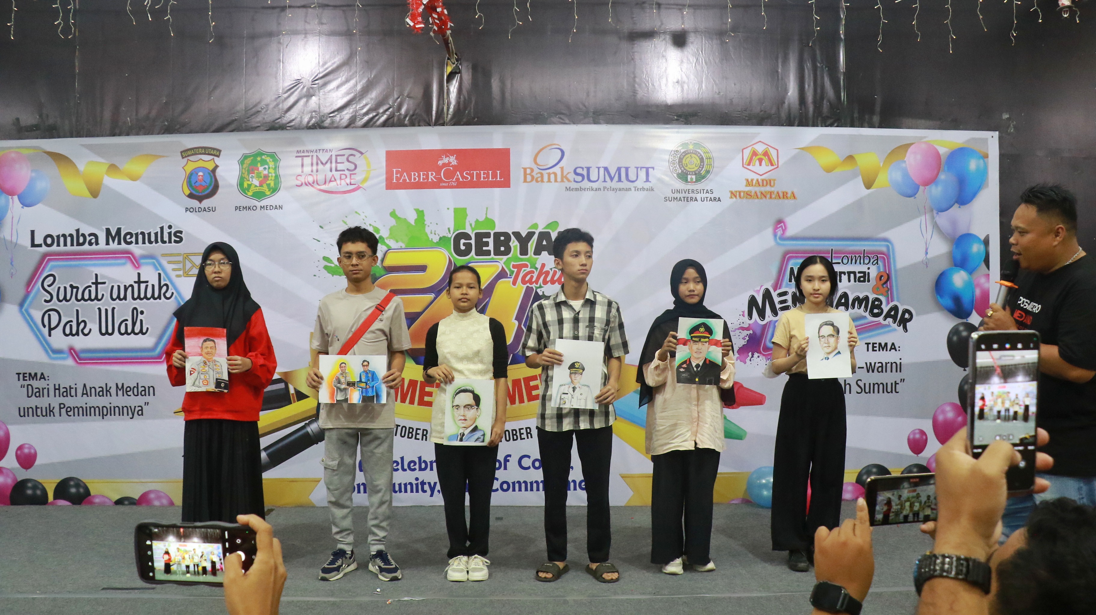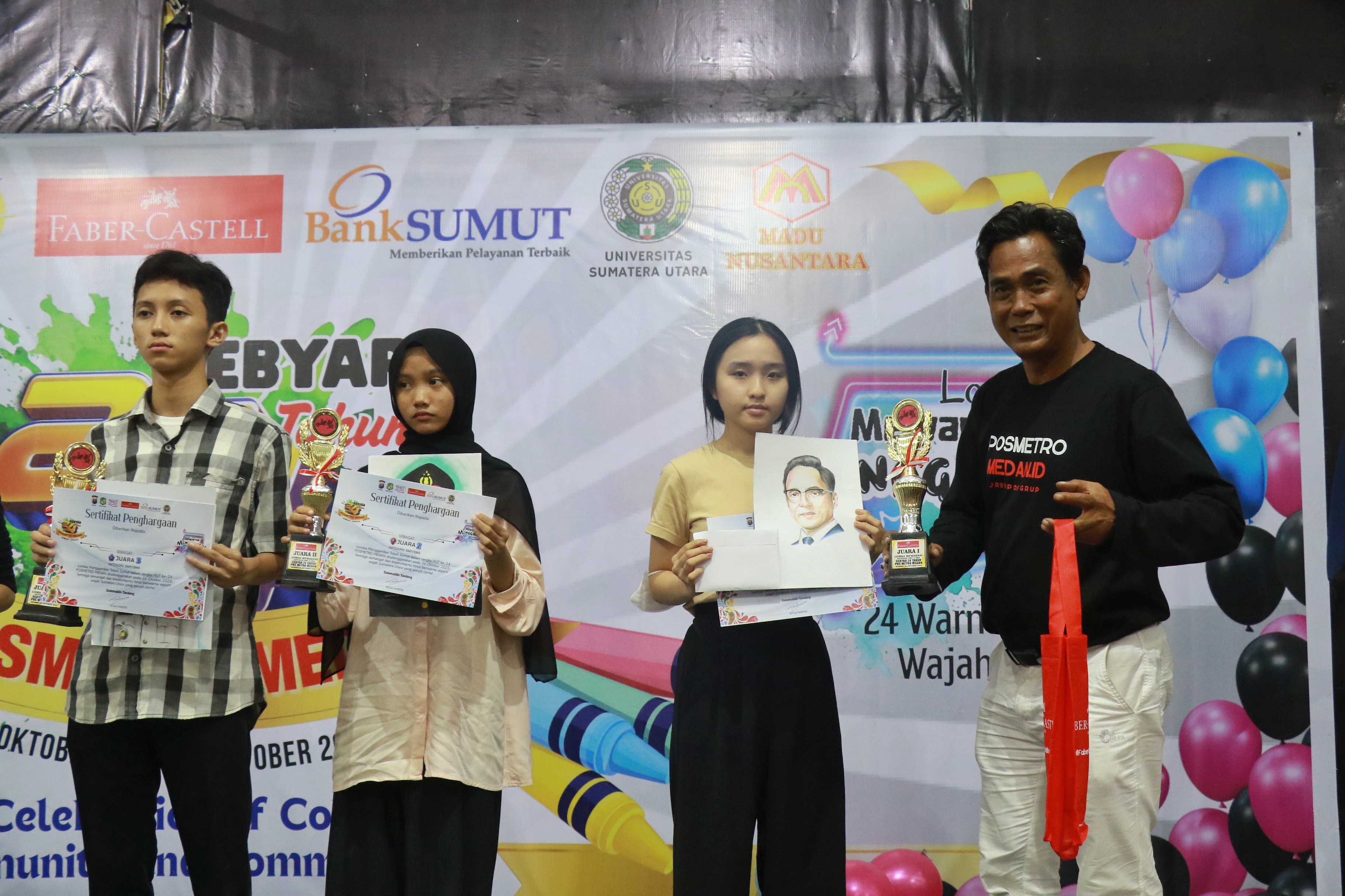 Dari ratusan karya yang menghiasi aula, Medeli F dari SMA Sutomo 2 Medan berhasil meraih Juara 1 LombaMenggambar. Goresannya dinilai paling kuat dalam memadukan warna, pesan, dan kedalaman makna pada potret visual bertajuk, Wajah Warna-Warni Sumut".