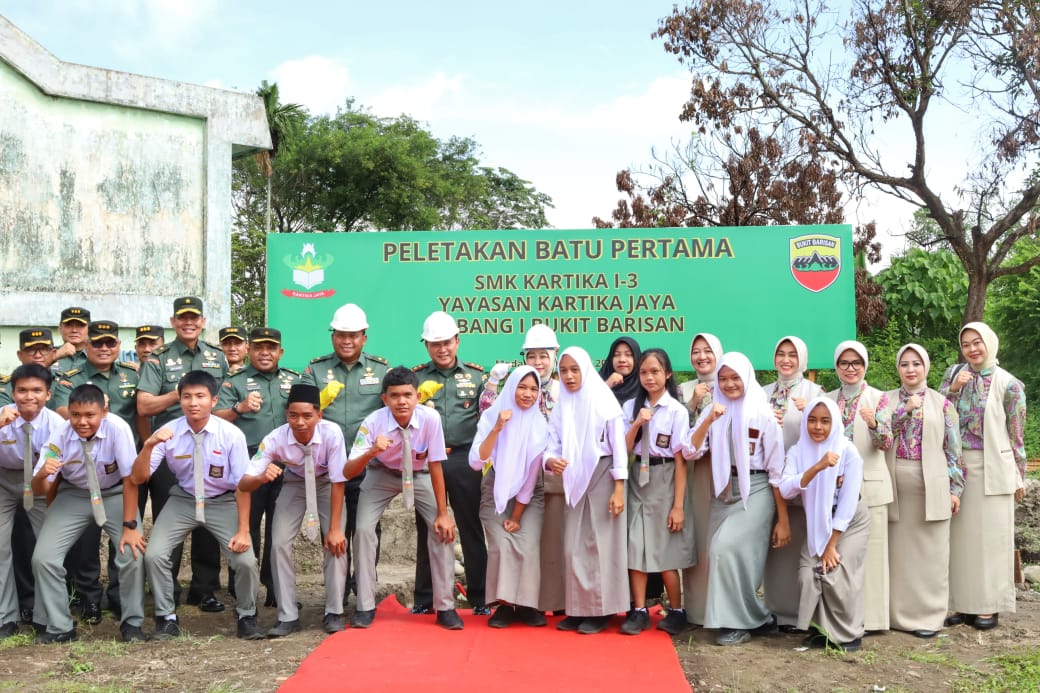 POSMETRO MEDAN, Medan – Pangdam I/Bukit Barisan Mayjen TNI Rio Firdianto bersama Ketua Yayasan Kartika Jaya Cabang I/Bukit Barisan Ny. Galuh Rio Firdianto meletakkan batu pertama pembangunan ruang kelas baru di SMK Kartika I-3, Jalan H. A. Manaf Lubis, Gaperta, Medan, Rabu (29/10/2025). Peletakan batu pertama ini menjadi simbol dimulainya pembangunan fasilitas baru bagi sekolah di bawah binaan Yayasan Kartika Jaya.