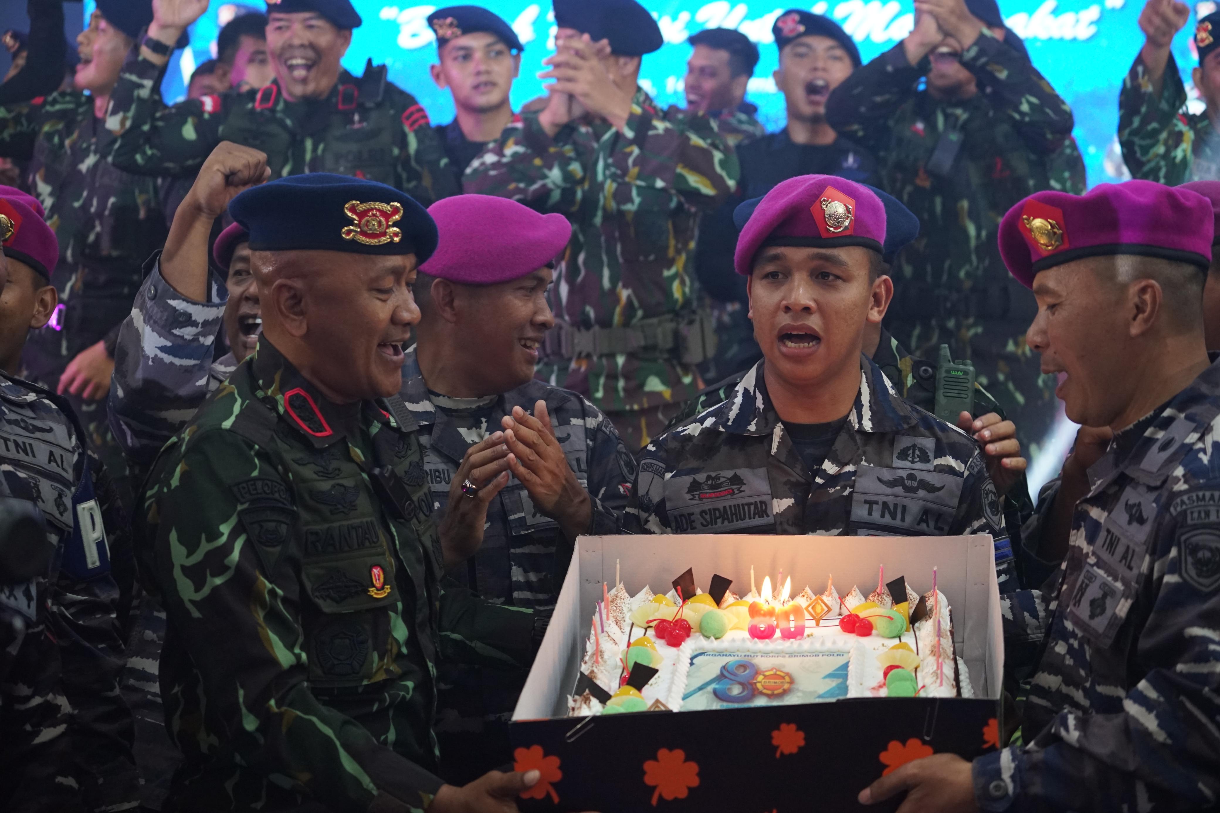 Kemeriahan acara semakin terasa saat sahabat-sahabat dari Korps Marinir hadir memberikan kejutan berupa kue ulang tahun untuk Brimob Polda Sumut. Momen ini semakin spesial karena Korps Marinir juga akan merayakan Hari Ulang Tahun mereka pada 15 November, sehingga tercipta suasana penuh keakraban dan soliditas antara TNI–Polri.