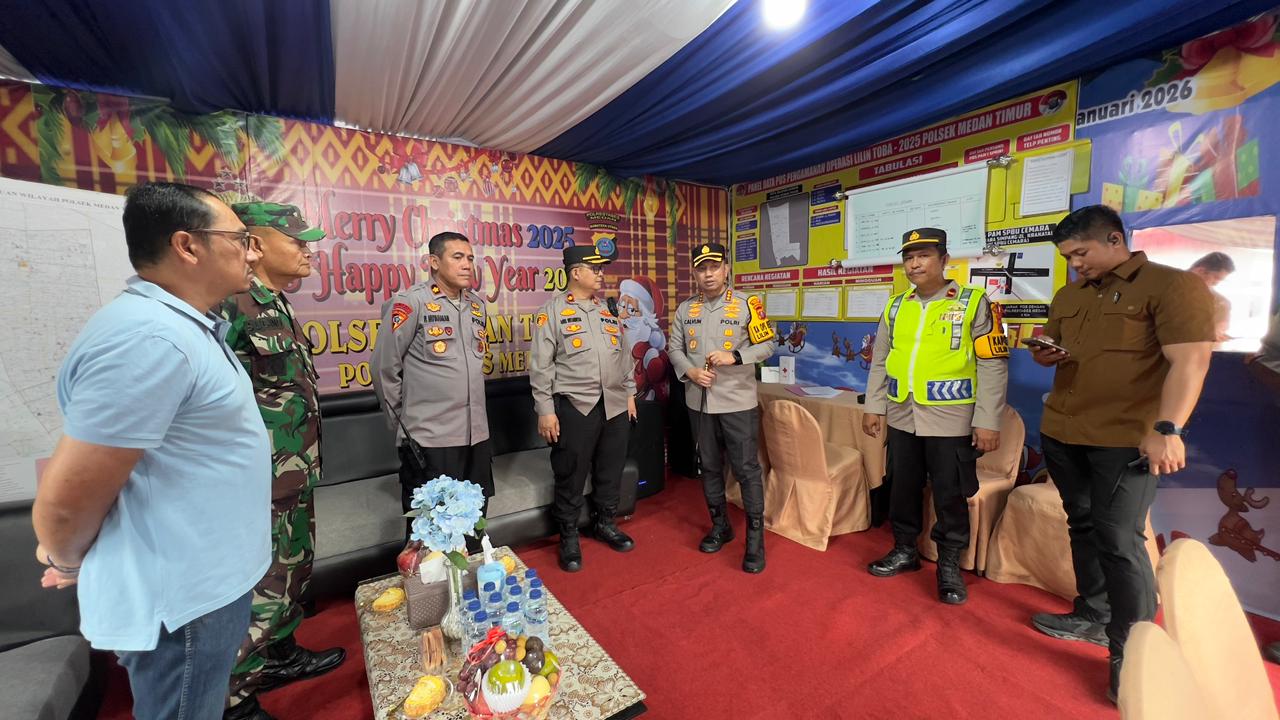 POSMETRO MEDAN, Medan– Kapolrestabes Medan, Kombes Pol Dr. Jean Calvijn Simanjuntak, S.I.K., M.H., melakukan peninjauan langsung ke Pos Pengamanan (Pospam) Natal 2025 dan Tahun Baru 2026 yang berlokasi di Simpang Haji Anif, Medan Tembung, Jumat (26/12/2025).