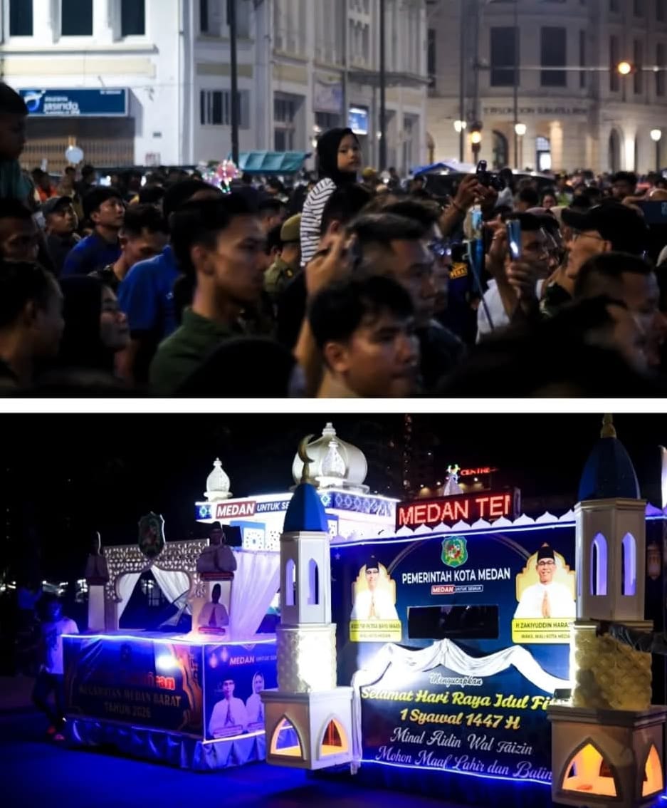 Dalam suasana yang juga semarak dan penuh suka cita ini terlihat ribuan warga tumpah ruah memadati kawasan Lapangan Merdeka Medan untuk menyaksikan Pawai Mobil Hias. Mereka datang bersama keluarga dari berbagai penjuru kota. Anak-anak tampak antusias, sementara orang tua menikmati suasana malam yang dipenuhi lantunan takbir dan gemerlap lampu kendaraan hias yang berjejer rapi menunggu giliran berparade.