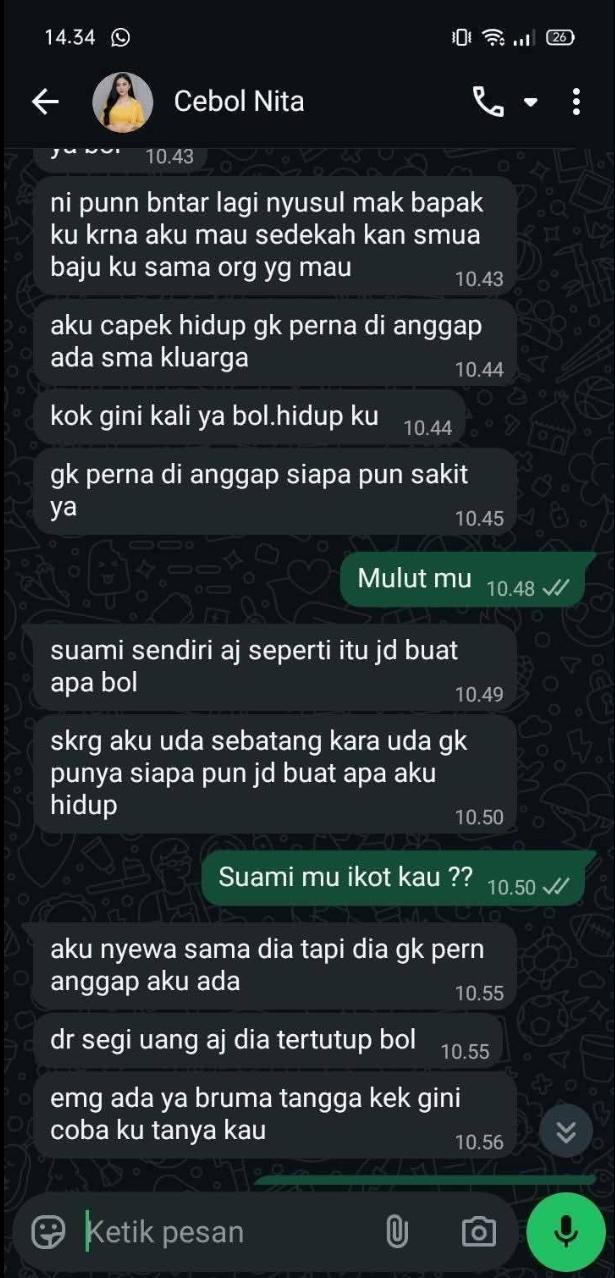 "Aku capek hidup…Enggak pernah dianggap keluarga atau siapa pun…Suami sendiri saja seperti itu. Jadi buat apa?" demikian kutipan isi Chat korban dengan temannya yang beredar di tengah warga.