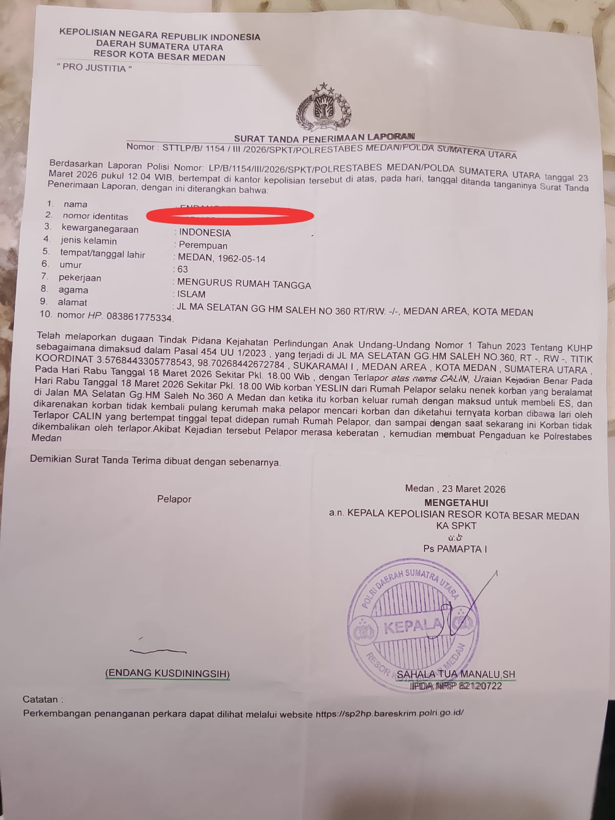 Peristiwa tersebut telah dilaporkan ke Polrestabes Medan oleh nenek korban, E (65), warga Jalan Medan Area Selatan. Laporan polisi tercatat dengan nomor: STTLP/B/1154/III/2026/SPKT/POLRESTABES MEDAN/POLDA SUMATERA UTARA, tertanggal 23 Maret 2026, terkait dugaan membawa lari anak di bawah umur.
