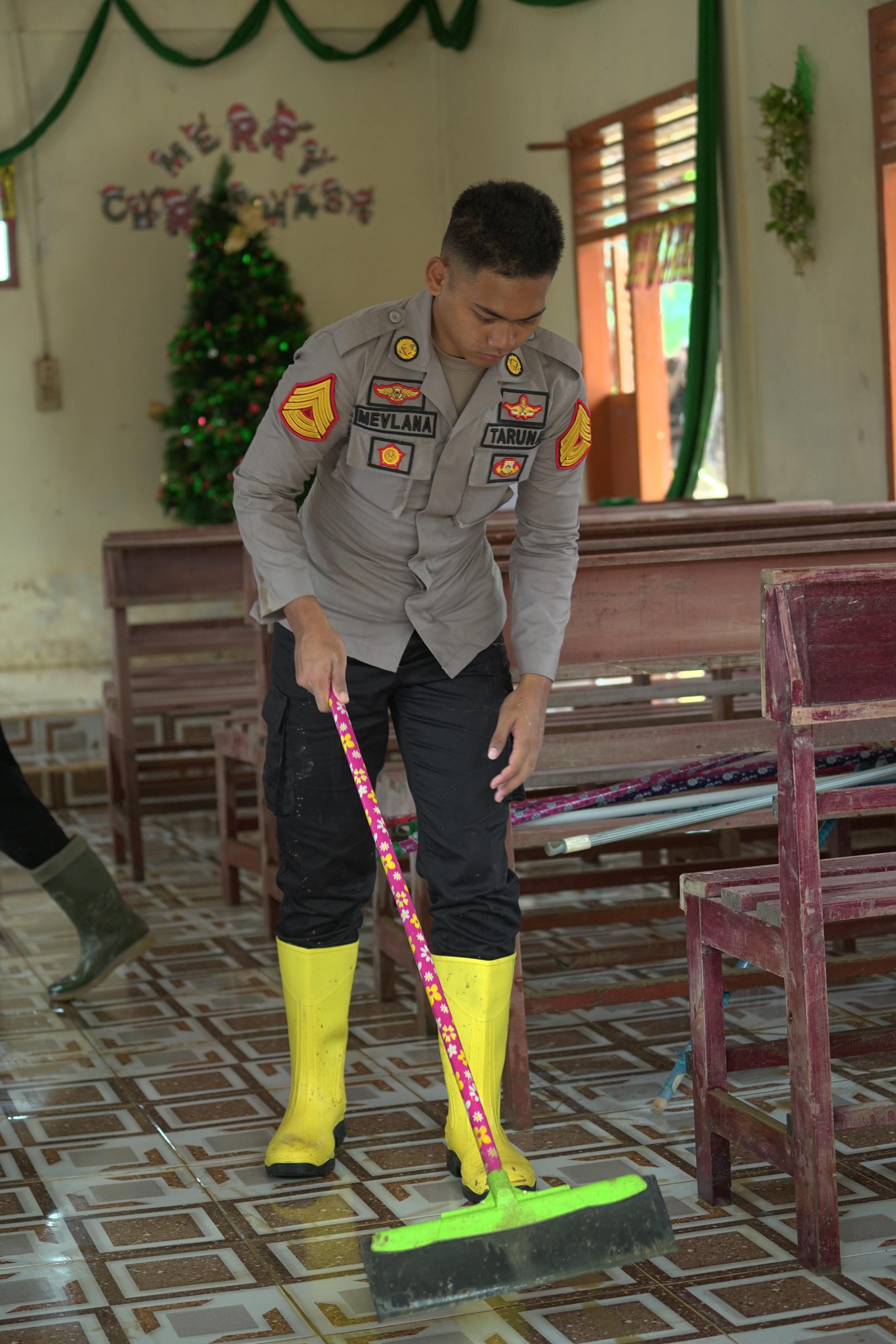 Kegiatan diawali dengan pembersihan Gereja GKPA Huta Godang yang sebelumnya kembali terendam akibat luapan air. Personel Brimob Polda Sumut bersama Taruna Tingkat III, Mavlana Faza Zuhdan SatyaBumi, bahu-membahu membersihkan lumpur, sampah, dan sisa material banjir yang mengotori rumah ibadah tersebut.