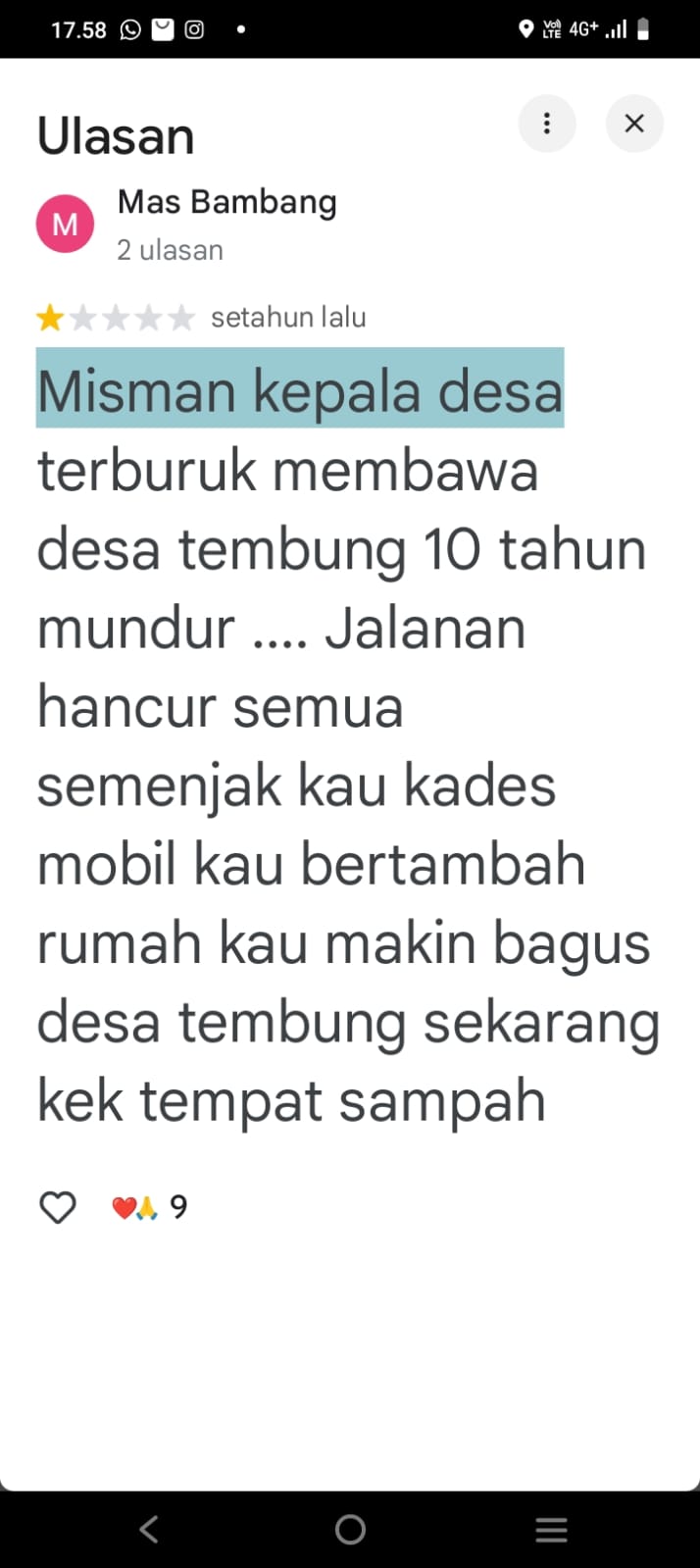 Dalam ulasan yang diunggah akun bernama Mas Bambang, disebutkan bahwa kepala desa diduga memiliki mobil baru dan rumah yang dinilai mewah.
