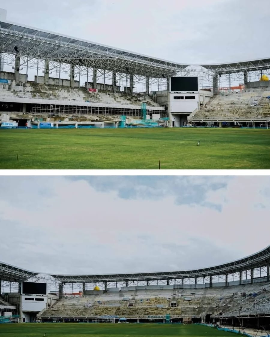 dan meninjau langsung kondisi lapangan serta fasilitas penunjang yang ditargetkan bertaraf internasional. Dari hasil peninjauan, Rico Waas menyebut struktur utama bangunan pada dasarnya telah selesai dan kini tinggal tahap penyempurnaan.