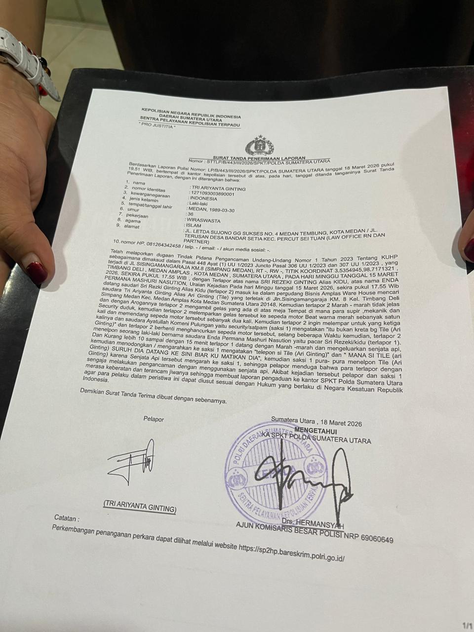 Berdasarkan laporan polisi bernomor LP/B/321/III/2026/SPKT/POLDA SUMATERA UTARA, kejadian bermula saat seorang wanita berinisial SRG alias Kidu (terlapor 2) mendatangi lokasi. Tanpa alasan yang jelas, Kidu mengamuk dan bertindak anarkis dengan melempar gelas ke arah sepeda motor milik korban, Tri Ariyanta Ginting alias Tile.